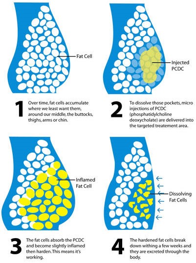 The injected solution causes the fat cells to harden, break down, and gradually transform into tiny particles. These particles are then flushed out naturally by your body’s metabolic processes, primarily via the liver.